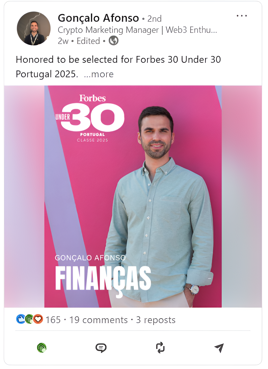 The list was first announced on the official Forbes Portugal Instagram account, @forbespt. It also includes professionals from other areas including sports, science, sustainability, technology, and the arts, with names like professional footballer Rúben Gato Dias, musician Ivandro, and AI strategist Mafalda Rebordão.