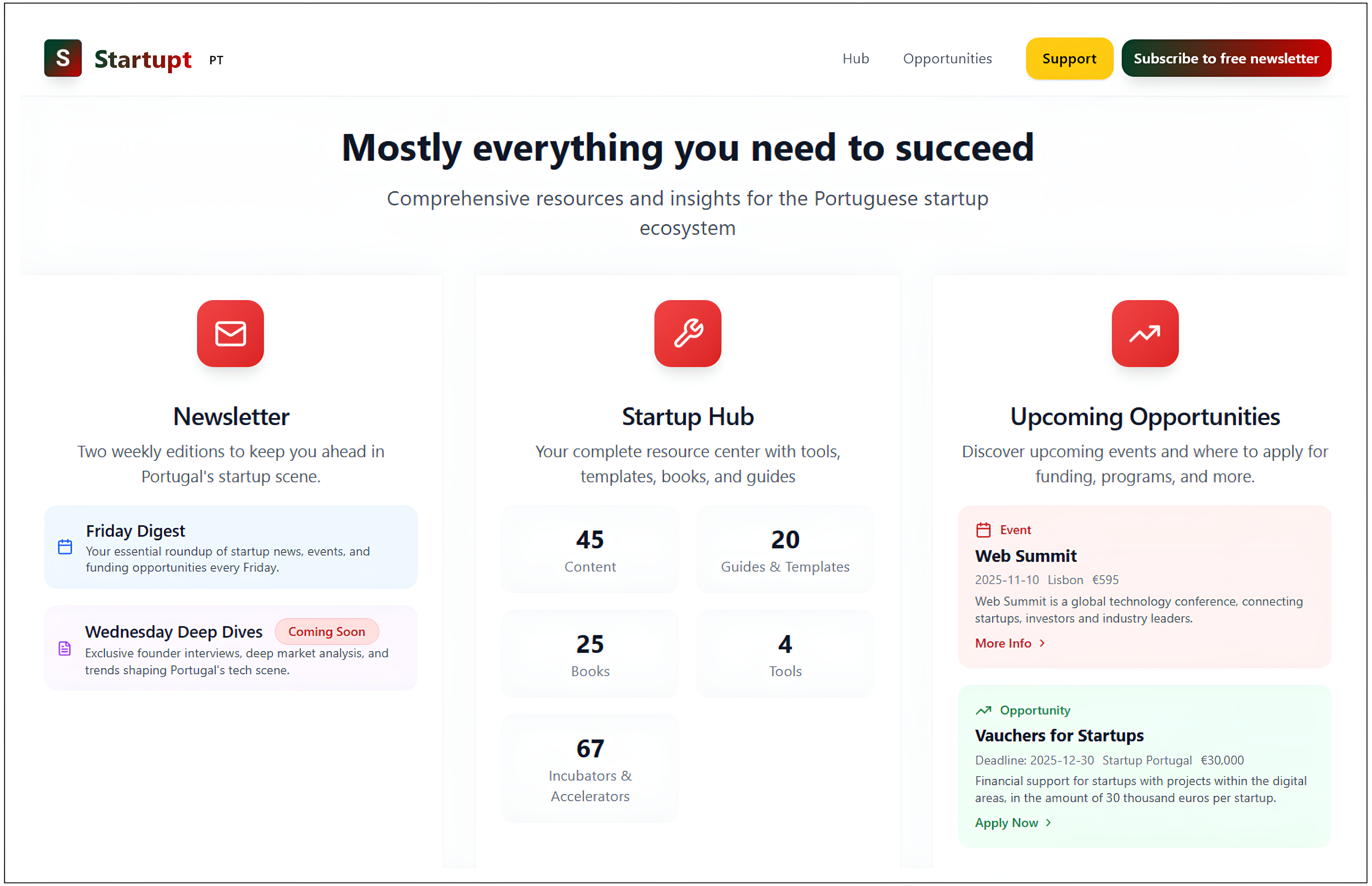 “The newest version of Startupt isn’t just a newsletter anymore. I realized that being merely a news aggregator doesn’t provide enough value to founders, investors, or anyone in the Portuguese startup ecosystem. That’s when the concept of a go-to resources index came about,” added Yakupov, who is also the founder of Novocean, specializing in tailored AI solutions and automation for content creation, distribution, and performance analysis.