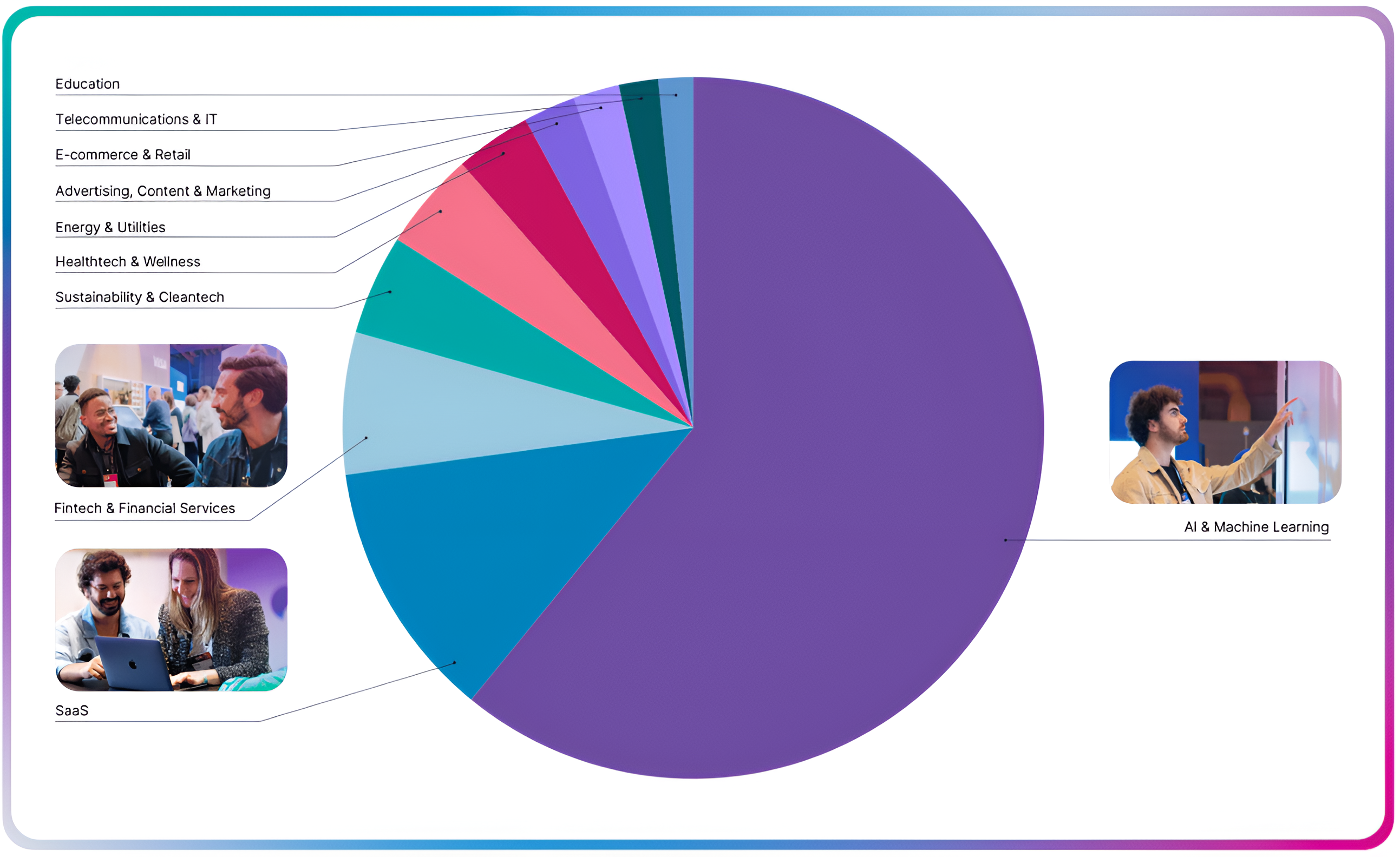 Other funded companies operate in SaaS, fintech, sustainability and cleantech, healthtech and wellness, energy and utilities, advertising and marketing, e-commerce and retail, telecommunications and IT, and education.