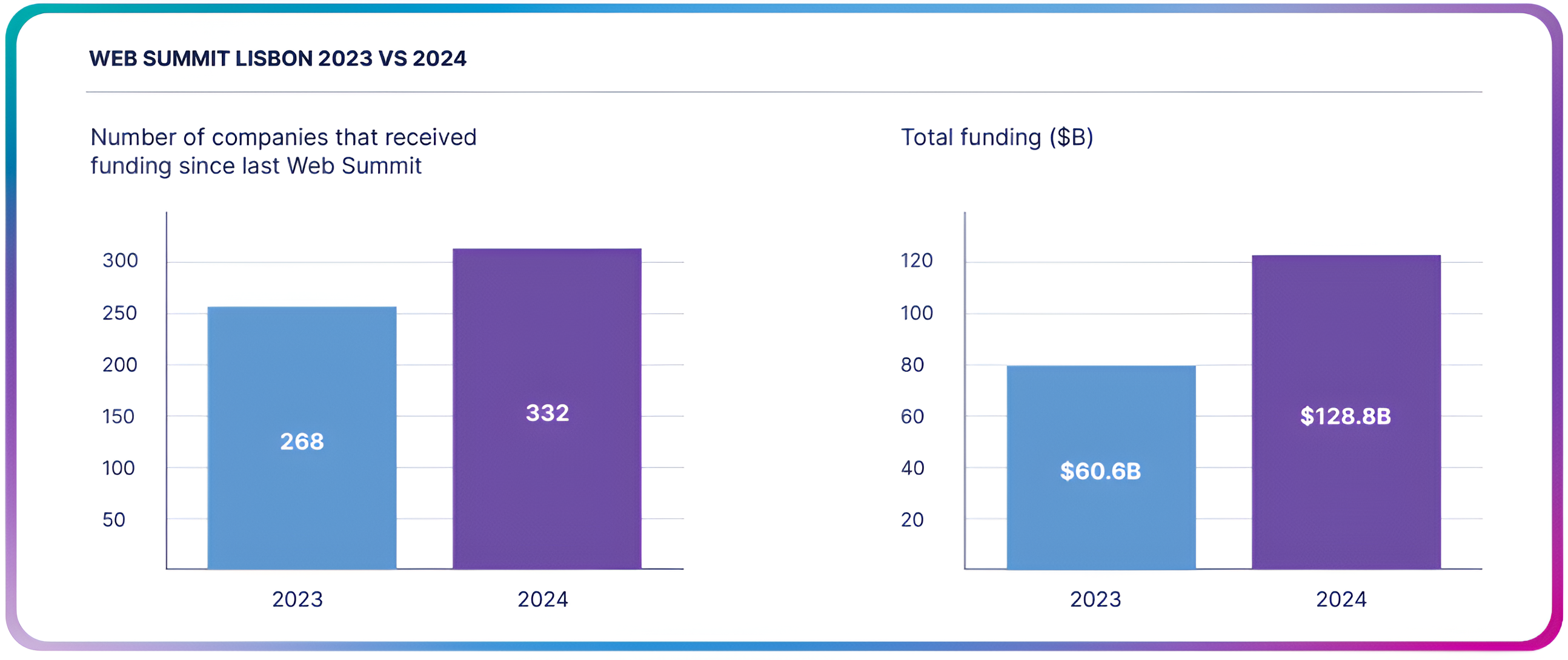 Beyond post-event funding, the report notes a broader capital trend: 332 companies that attended Web Summit 2024, including startups, speakers, and partners, have collectively raised $128.8 billion since last year’s event. This total is more than double the $60.6 billion raised by companies after the 2023 edition.