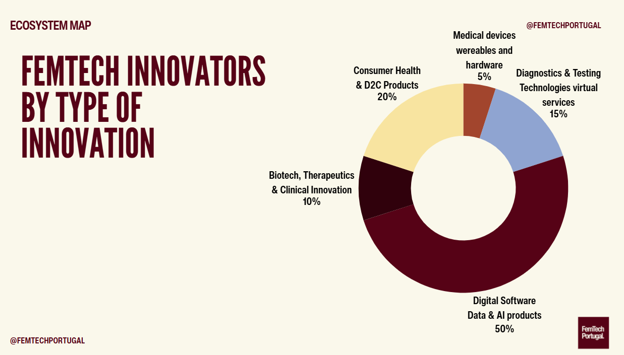 FemTech Portugal also said 50% of femtech innovation in Portugal is in digital software, data, and AI products. Consumer health and direct-to-consumer products account for 20%, while biotech, therapeutics, and clinical innovation account for 10%.